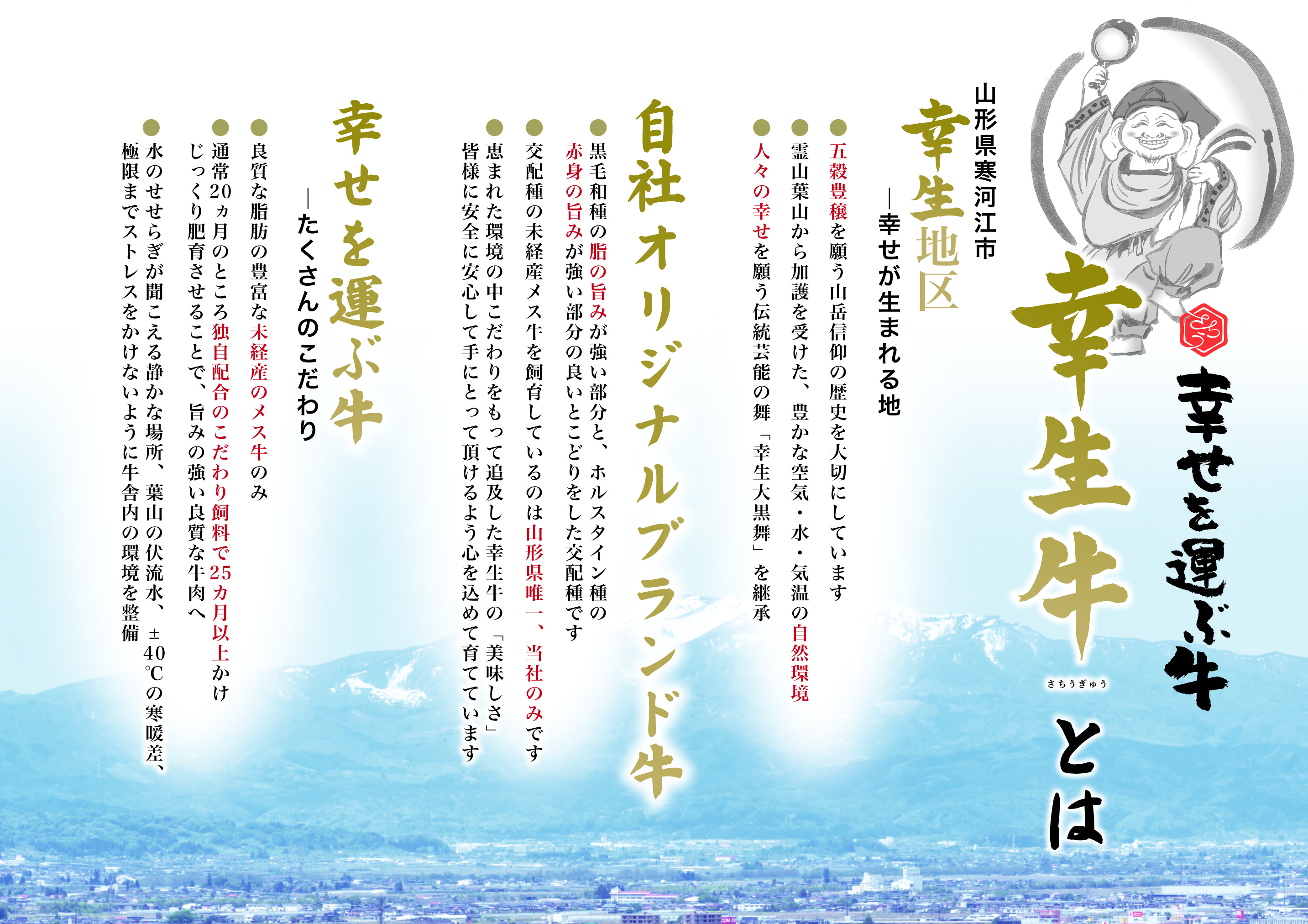 自然豊かな寒河江市幸生(さちう)地区で育てられた幸生牛。黒毛和種の脂の旨みが強いが強い部分の良いとこどりをした交配種です。恵まれた環境でこだわりを持って追及した「美味しさ」をぜひご賞味ください。