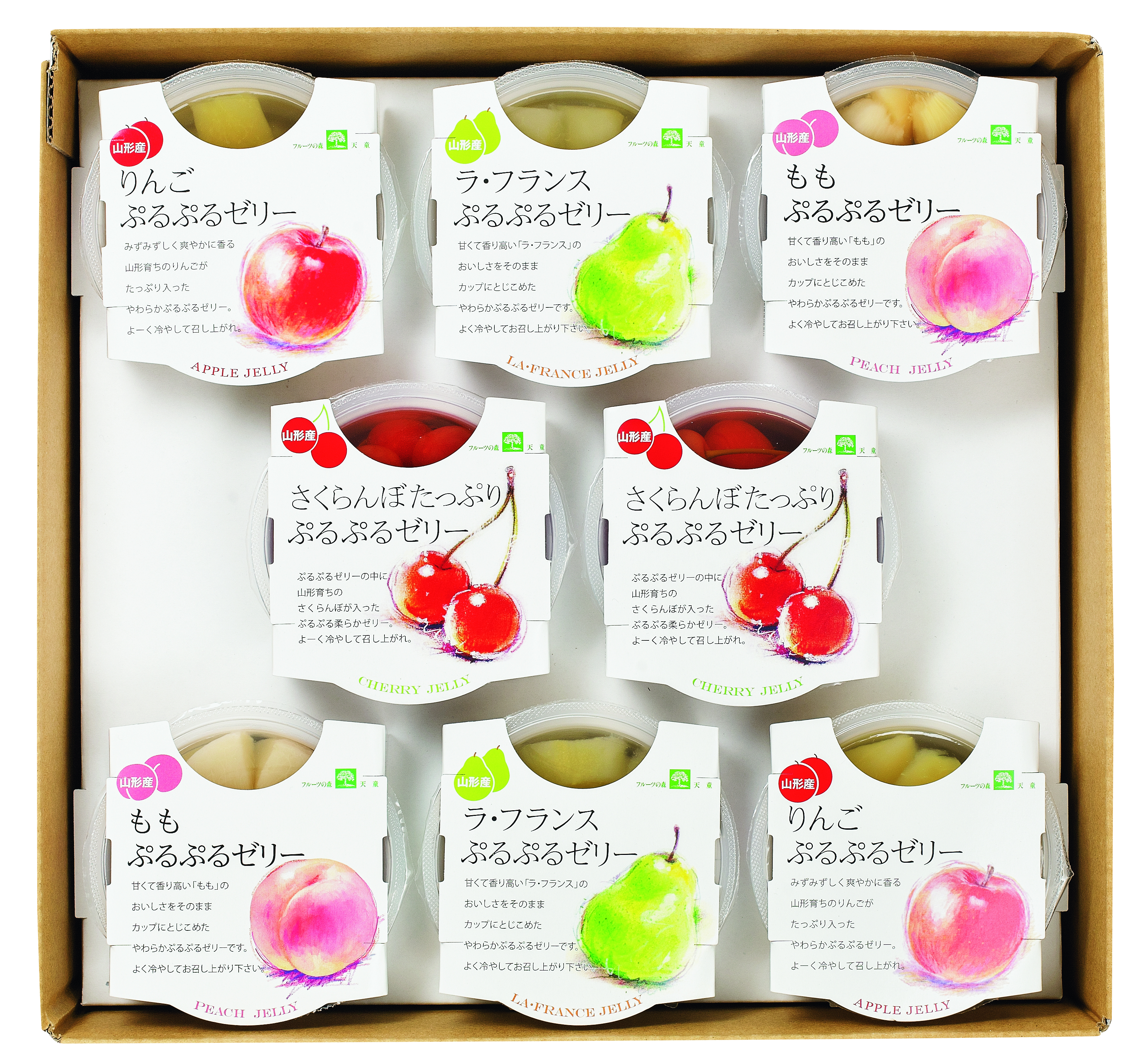 山形のさくらんぼ、ラ・フランス、りんご、ももがたっぷり入ったゼリーです。